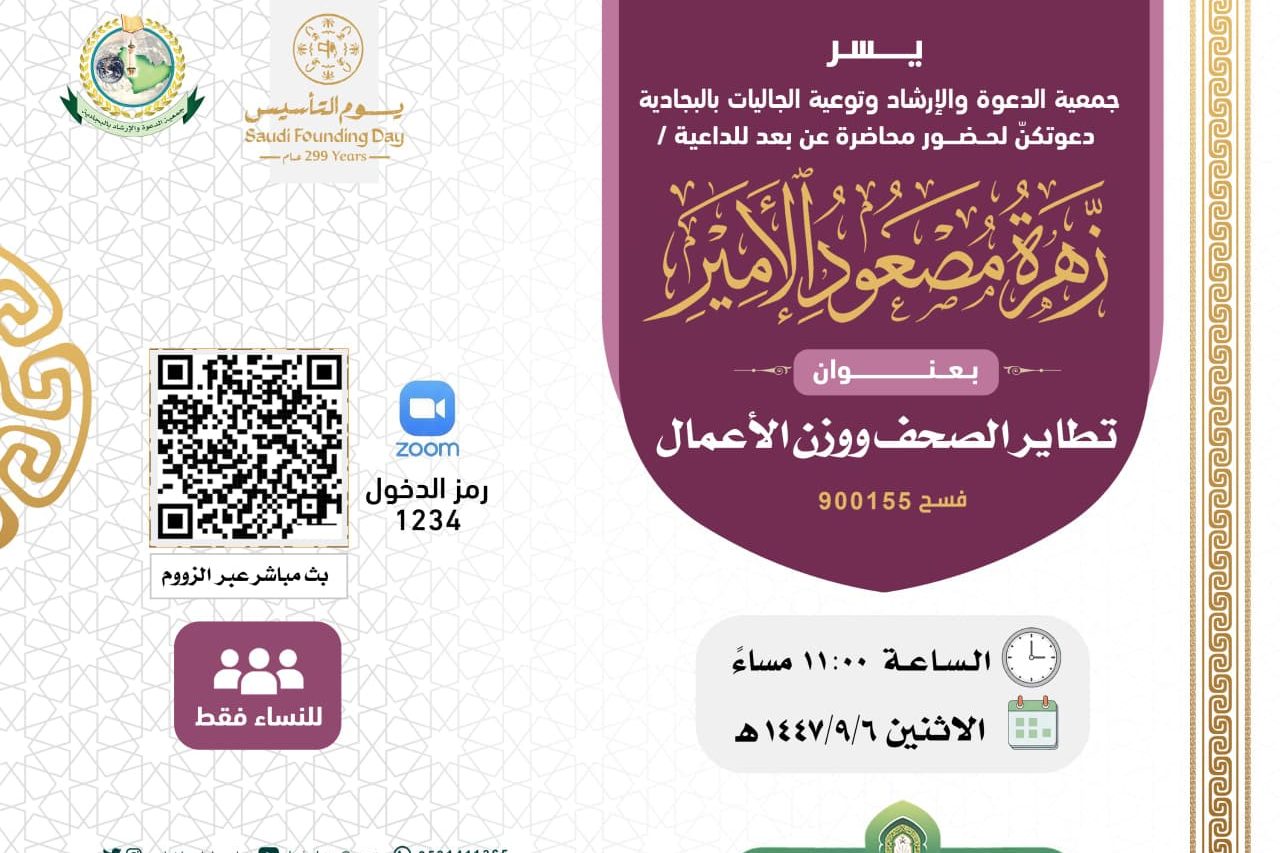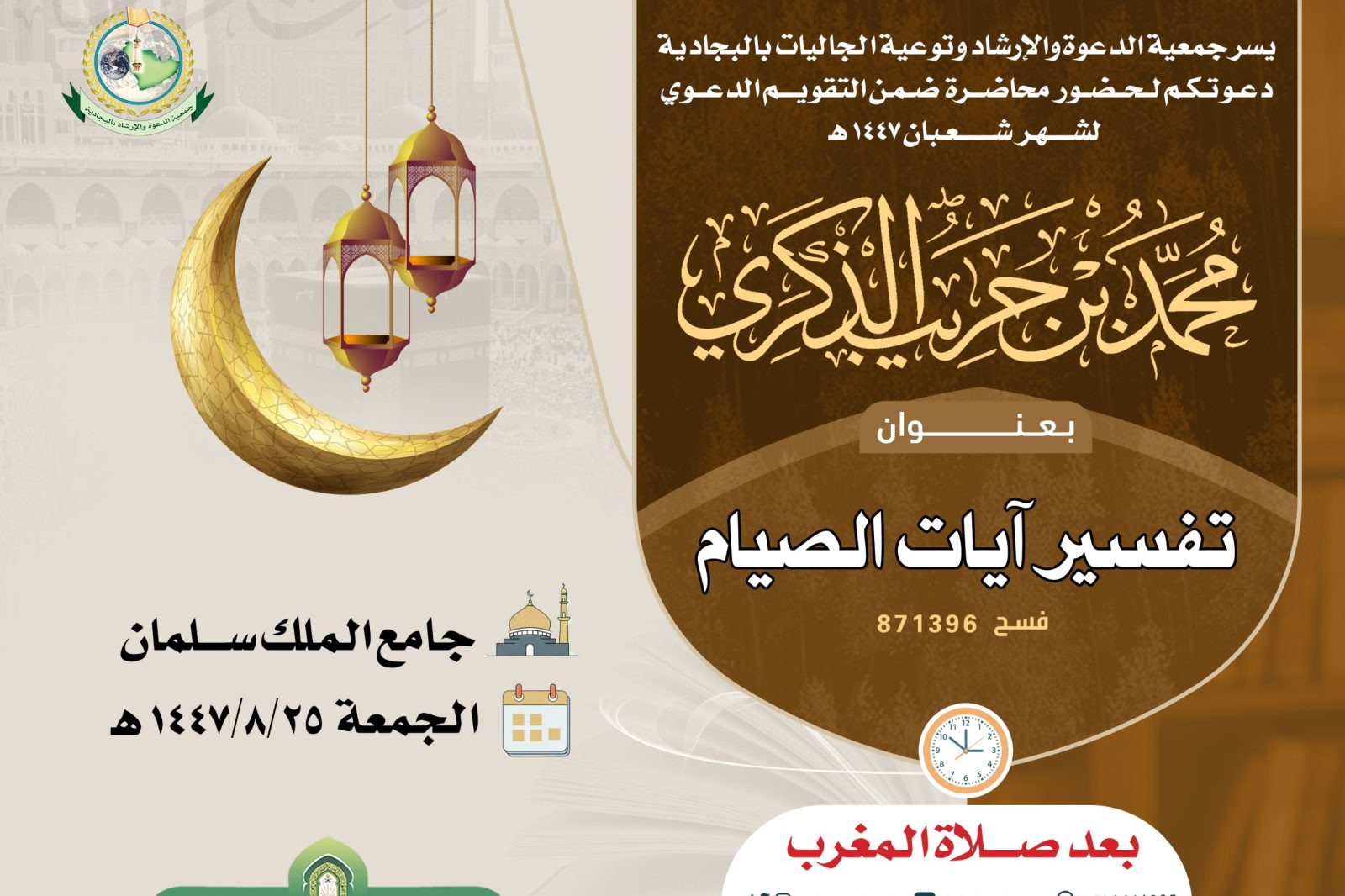 تدعوكم جمعية الدعوة والارشاد وتوعية الجاليات بالبجادية لحضور محاضرة لفضيلة الشيخ/محمد بن حريب الذكري بتاريخ 25-8-1447هـ فسح رقم 871396