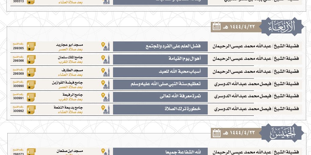 نوفمبر102022الأخبارعام غرِّد السلام عليكم ورحمة الله وبركاته نرفق لكم البرامج الدعوية لشهر ربيع الثاني كما هو موضح في الجدول التالي:- غرِّد أخبار ذات صلةدرس علمي للنساء بعنوان [الأوراد والأذكار الشرعية في حياة المسلم]الخميس _4 _ديسمبر _2025AH 4-12-2025ADمحاضرة نسائية عن بعد للداعية / مضاوي عبدالرحمن عبدالله الدوسريالأربعاء _3 _ديسمبر _2025AH 3-12-2025ADبرنامج دعوي لفضيلة الشيخ عبدالرحمن بن فهد ودعانالثلاثاء _18 _نوفمبر _2025AH 18-11-2025ADبرنامج دعوي لفضيلة الشيخ أحمد بن عبدالله السلميالأحد _16 _نوفمبر _2025AH 16-11-2025ADبرنامج دعوي يوم الخميس الموافق 1447/5/22هـالأثنين _10 _نوفمبر _2025AH 10-11-2025ADالجمعية تحصل على درجة 97.26% في تقييم معايير الحوكمةالأثنين _10 _نوفمبر _2025AH 10-11-2025AD