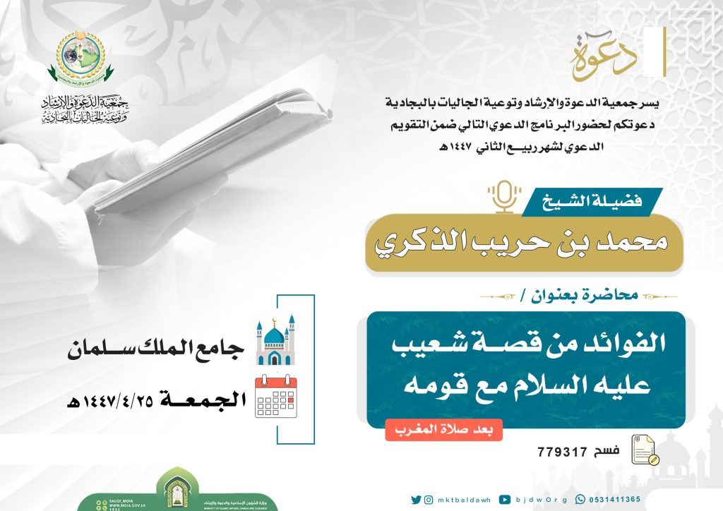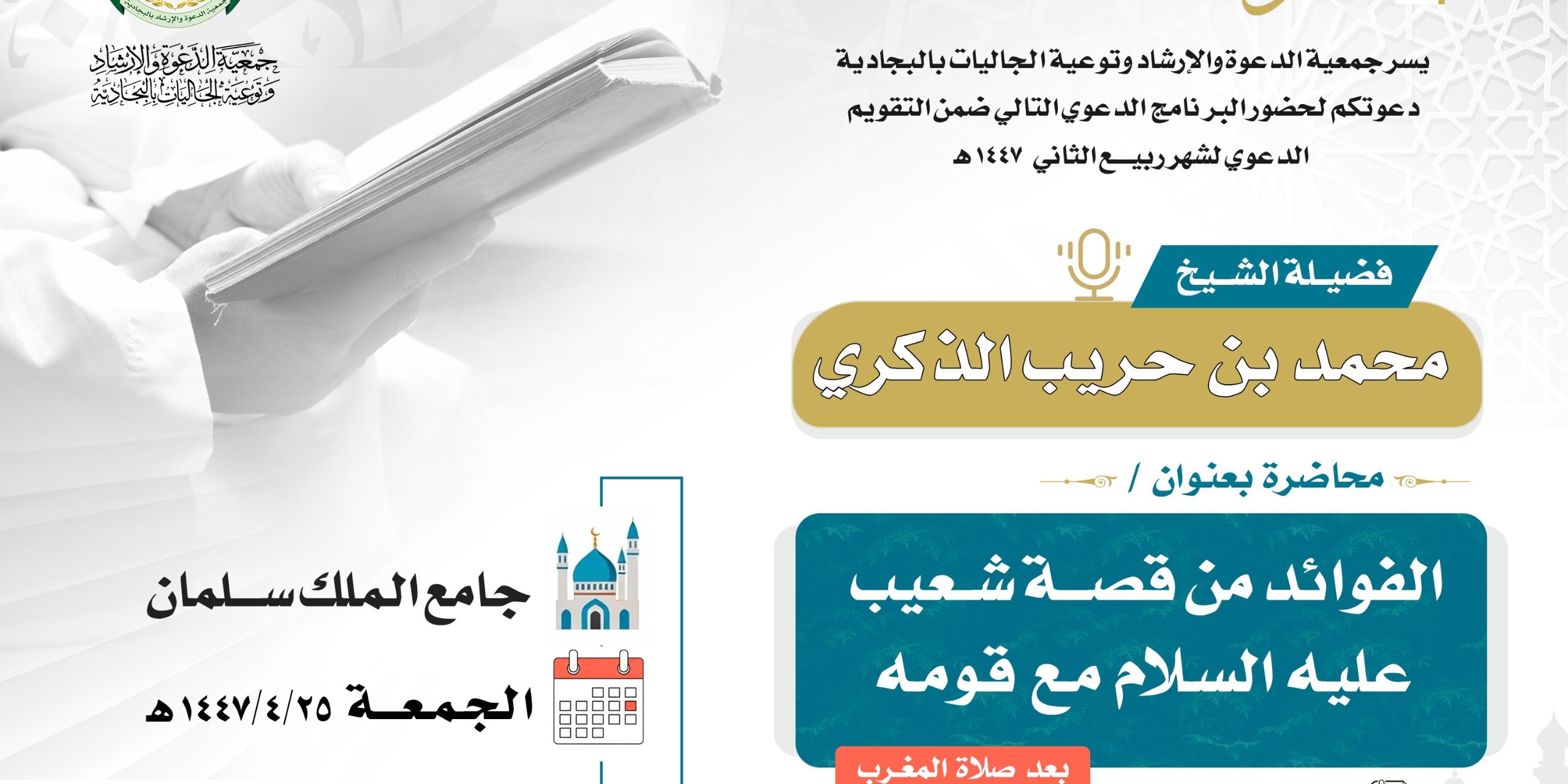 أكتوبر142025الأخبارالأخبار غرِّد تدعوكم جمعية الدعوة بـ #البجادية لحضور البرنامج الدعوي التالي ضمن التقويم الدعوي لشهر ربيع الثاني من العام 1447هـ لفضيلة الشيخ/محمد بن حريب الذكري بعنوان /الفوائد من قصة شعيب عليه السلام مع قومه يوم الجمعة 1747/4/25هـ بعد صلاة المغرب غرِّد أخبار ذات صلةدرس علمي للنساء بعنوان [الأوراد والأذكار الشرعية في حياة المسلم]الخميس _4 _ديسمبر _2025AH 4-12-2025ADمحاضرة نسائية عن بعد للداعية / مضاوي عبدالرحمن عبدالله الدوسريالأربعاء _3 _ديسمبر _2025AH 3-12-2025ADبرنامج دعوي لفضيلة الشيخ عبدالرحمن بن فهد ودعانالثلاثاء _18 _نوفمبر _2025AH 18-11-2025ADبرنامج دعوي لفضيلة الشيخ أحمد بن عبدالله السلميالأحد _16 _نوفمبر _2025AH 16-11-2025ADبرنامج دعوي يوم الخميس الموافق 1447/5/22هـالأثنين _10 _نوفمبر _2025AH 10-11-2025ADالجمعية تحصل على درجة 97.26% في تقييم معايير الحوكمةالأثنين _10 _نوفمبر _2025AH 10-11-2025AD