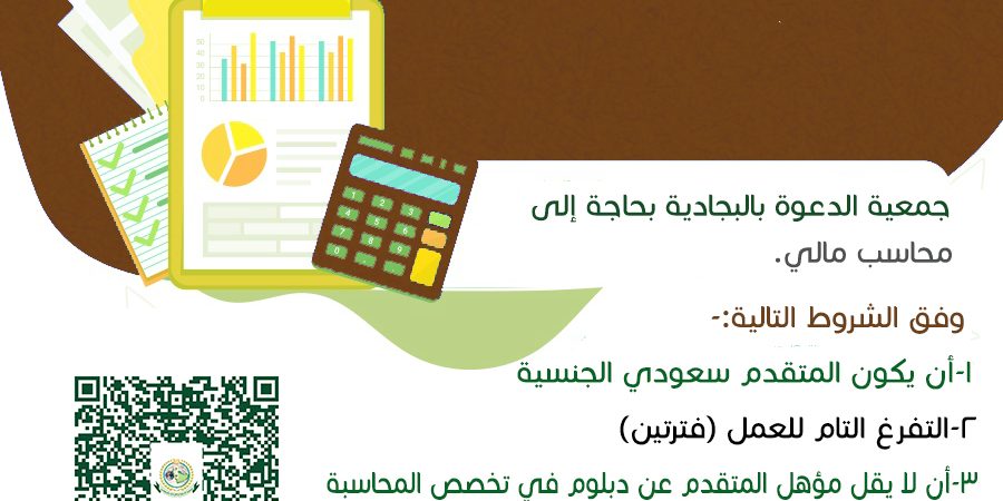 أكتوبر122022الأخبارعام غرِّد السلام عليكم ورحمة الله وبركاته جمعية الدعوة بالبجادية بحاجة إلى محاسب مالي:- وفق الشروط التالية:- 1-أن يكون المتقدم سعودي الجنسية 2-التفرغ التام للعمل (فترتين) 3-أن لا يقل مؤهل المتقدم عن دبلوم في تخصص المحاسبة 4-يفضل السكن في نطاق المحافظة 5- إجادة إستخدام الحاسب الآلي 6- يفضل من لديه خبرة في مجال المحاسبة المميزات:- 1- راتب 6000 ريال 2- التسجيل في التأمينات للتقـــــــــــــــديم او ارسال السيرة الذاتية عبر الأيميل bj.dw@hotmail.com غرِّد أخبار ذات صلةدرس علمي للنساء بعنوان [الأوراد والأذكار الشرعية في حياة المسلم]الخميس _4 _ديسمبر _2025AH 4-12-2025ADمحاضرة نسائية عن بعد للداعية / مضاوي عبدالرحمن عبدالله الدوسريالأربعاء _3 _ديسمبر _2025AH 3-12-2025ADبرنامج دعوي لفضيلة الشيخ عبدالرحمن بن فهد ودعانالثلاثاء _18 _نوفمبر _2025AH 18-11-2025ADبرنامج دعوي لفضيلة الشيخ أحمد بن عبدالله السلميالأحد _16 _نوفمبر _2025AH 16-11-2025ADبرنامج دعوي يوم الخميس الموافق 1447/5/22هـالأثنين _10 _نوفمبر _2025AH 10-11-2025ADالجمعية تحصل على درجة 97.26% في تقييم معايير الحوكمةالأثنين _10 _نوفمبر _2025AH 10-11-2025AD