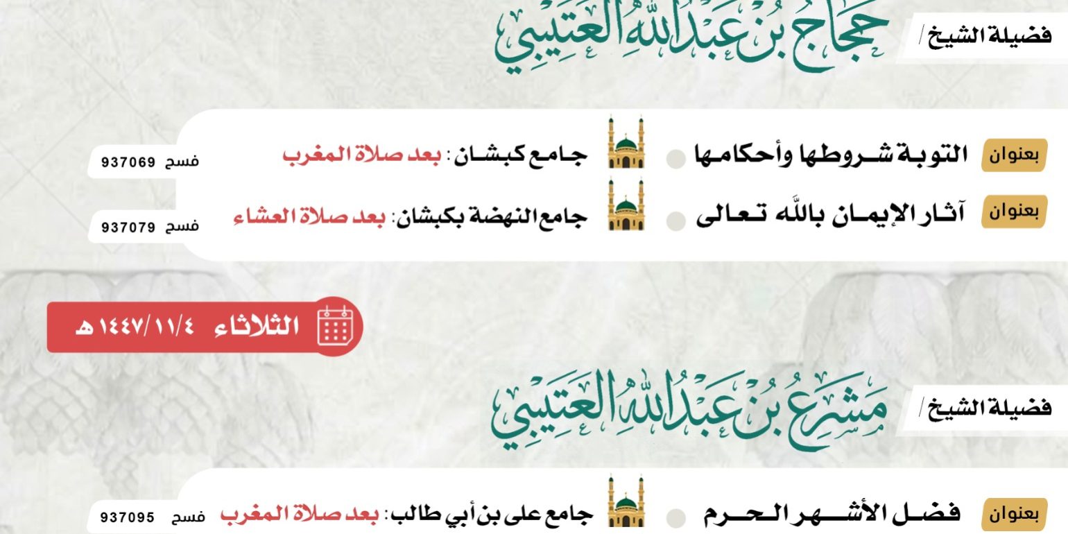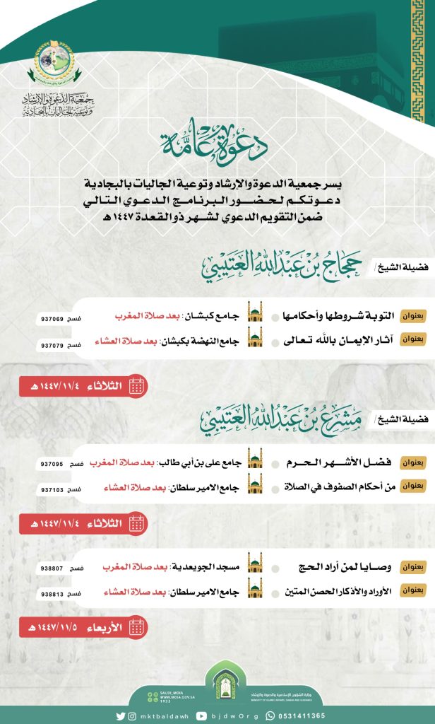 أبريل222026الأخبارالأخبار غرِّد تدعوكم جمعية الدعوة والارشاد وتوعية الجاليات بالبجادية لحضور البرامج الدعوية التالية يومي الثلاثاء والاربعاء 4-5-11-1447هـ فضيلة الشيخ/حجاج بن عبدالله النفيعي فضيلة الشيخ/مشرع بن عبدالله النفيعي غرِّد أخبار ذات صلةدعوة لحضور برامج دعوية يومي الاربعاء والخميس 27-28-10-1447هـالثلاثاء _14 _أبريل _2026AH 14-4-2026ADمحاضرة نسائية بعنوان تطاير الصحف ووزن الأعمالالثلاثاء _24 _فبراير _2026AH 24-2-2026ADدرس علمي لفضيلة الشيخ/عبدالله بن غازي المطيريالأحد _15 _فبراير _2026AH 15-2-2026ADدعوة لحضورة محاضرة لفضيلة الشيخ/محمد بن حريب الذكريالأربعاء _11 _فبراير _2026AH 11-2-2026ADدرس علمي للنساء بعنوان [مسائل مهمة في الصيام]الأربعاء _11 _فبراير _2026AH 11-2-2026ADدعوة لحضور برنامج دعوي يوم الثلاثاء الموافق 22/8/1447الأثنين _9 _فبراير _2026AH 9-2-2026AD