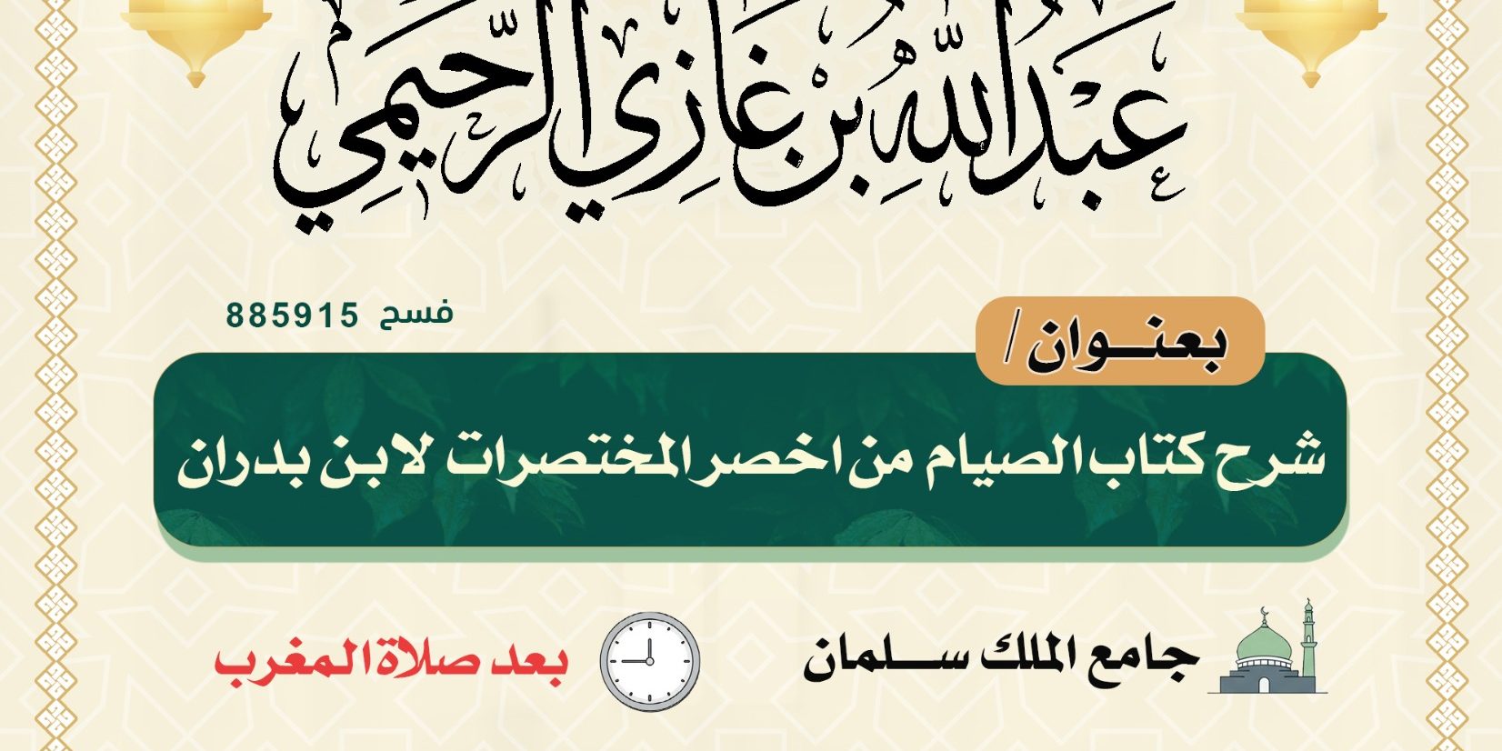 فبراير152026الأخبارالأخبار غرِّد تدعوكم جمعية الدعوة والارشاد وتوعية الجاليات بالبجادية لحضور درس علمي بعنوان/شرح كتاب الصيام من اخصر المختصرات لابن بدران لفضيلة الشيخ/عبدالله بن غازي المطيري بتاريخ 28-8-1447هـ غرِّد أخبار ذات صلةدعوة لحضورة محاضرة لفضيلة الشيخ/محمد بن حريب الذكريالأربعاء _11 _فبراير _2026AH 11-2-2026ADدرس علمي للنساء بعنوان [مسائل مهمة في الصيام]الأربعاء _11 _فبراير _2026AH 11-2-2026ADدعوة لحضور برنامج دعوي يوم الثلاثاء الموافق 22/8/1447الأثنين _9 _فبراير _2026AH 9-2-2026ADمحاضرة نسائية عن بعد الداعية / منال صالح الجهنيالخميس _5 _فبراير _2026AH 5-2-2026ADالبرامج الدعوية لشهر شعبان 1447هـالثلاثاء _27 _يناير _2026AH 27-1-2026ADدعوه محاضرة نسائية عن بعد الداعية / بثينه سلطان المقيرنالأربعاء _21 _يناير _2026AH 21-1-2026AD