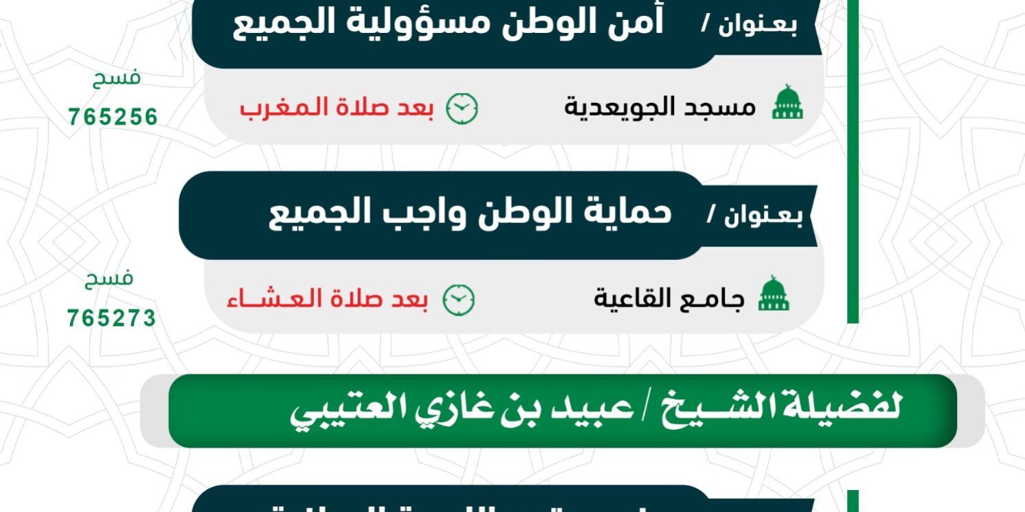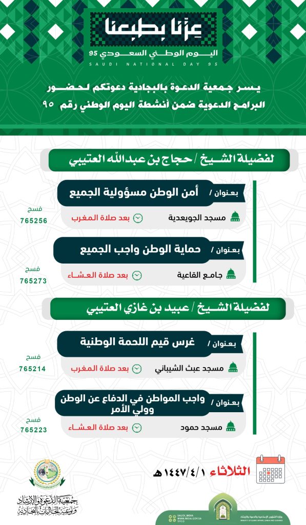 سبتمبر222025الأخبارالأخبار غرِّد السلام عليكم ورحمة الله وبركاته تدعوكم جمعية الدعوة بالبجادية لحضور برنامج دعويه ضمن أشطة اليوم الوطني 95 غرِّد أخبار ذات صلةدرس علمي للنساء بعنوان [الأوراد والأذكار الشرعية في حياة المسلم]الخميس _4 _ديسمبر _2025AH 4-12-2025ADمحاضرة نسائية عن بعد للداعية / مضاوي عبدالرحمن عبدالله الدوسريالأربعاء _3 _ديسمبر _2025AH 3-12-2025ADبرنامج دعوي لفضيلة الشيخ عبدالرحمن بن فهد ودعانالثلاثاء _18 _نوفمبر _2025AH 18-11-2025ADبرنامج دعوي لفضيلة الشيخ أحمد بن عبدالله السلميالأحد _16 _نوفمبر _2025AH 16-11-2025ADبرنامج دعوي يوم الخميس الموافق 1447/5/22هـالأثنين _10 _نوفمبر _2025AH 10-11-2025ADالجمعية تحصل على درجة 97.26% في تقييم معايير الحوكمةالأثنين _10 _نوفمبر _2025AH 10-11-2025AD