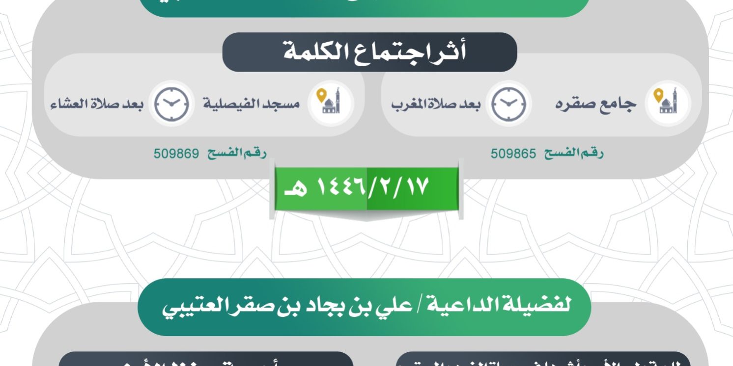 أغسطس192024الأخبارالأخبار غرِّد السلام عليكم ورحمة الله وبركاته تدعوكم جمعية الدعوة بالبجادية لحضور البرامج الدعوية لشهر صفر من العام 1446هـ ضمن أنشطة الأمن الفكري غرِّد أخبار ذات صلةدرس علمي للنساء بعنوان [الأوراد والأذكار الشرعية في حياة المسلم]الخميس _4 _ديسمبر _2025AH 4-12-2025ADمحاضرة نسائية عن بعد للداعية / مضاوي عبدالرحمن عبدالله الدوسريالأربعاء _3 _ديسمبر _2025AH 3-12-2025ADبرنامج دعوي لفضيلة الشيخ عبدالرحمن بن فهد ودعانالثلاثاء _18 _نوفمبر _2025AH 18-11-2025ADبرنامج دعوي لفضيلة الشيخ أحمد بن عبدالله السلميالأحد _16 _نوفمبر _2025AH 16-11-2025ADبرنامج دعوي يوم الخميس الموافق 1447/5/22هـالأثنين _10 _نوفمبر _2025AH 10-11-2025ADالجمعية تحصل على درجة 97.26% في تقييم معايير الحوكمةالأثنين _10 _نوفمبر _2025AH 10-11-2025AD