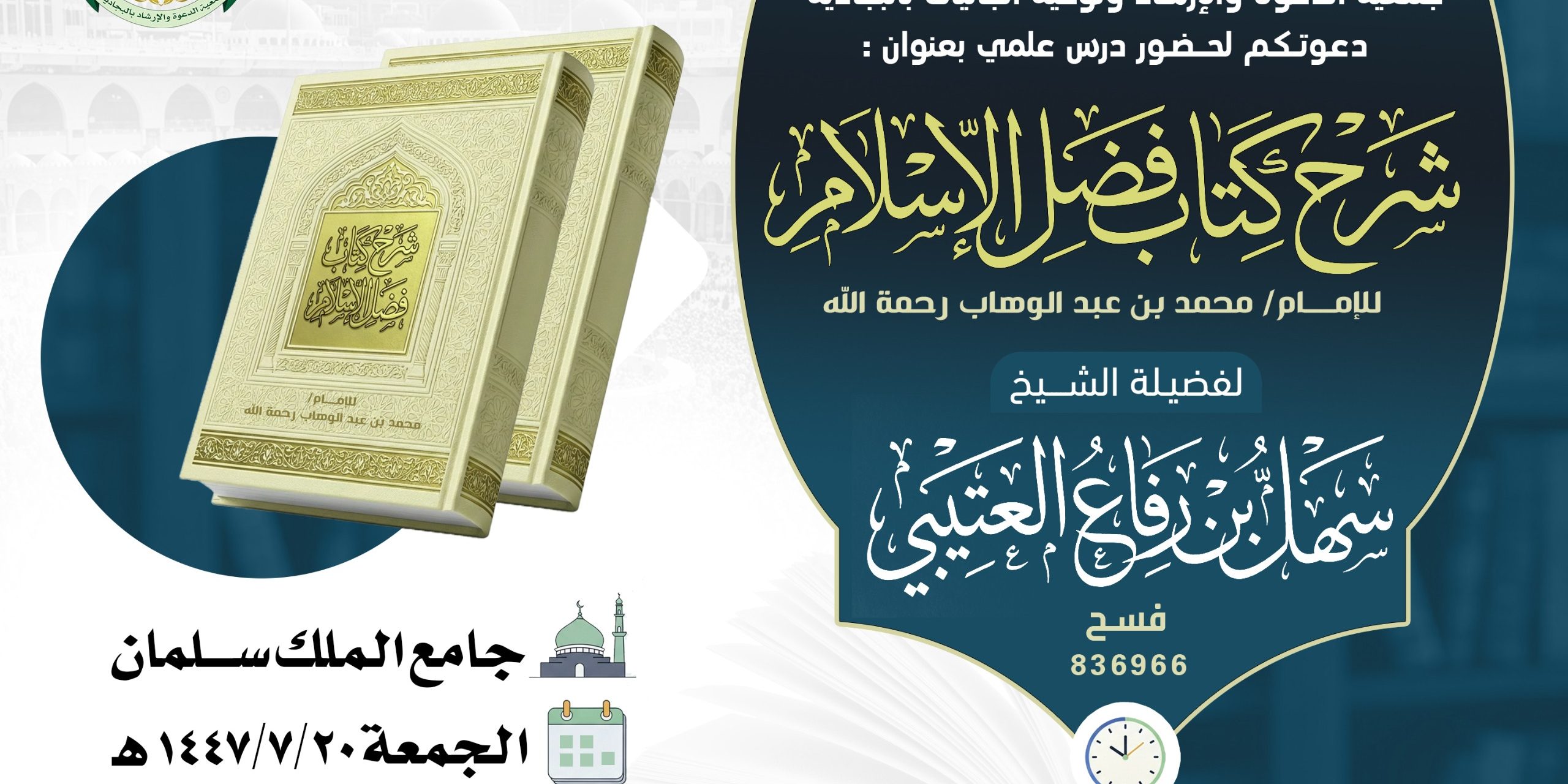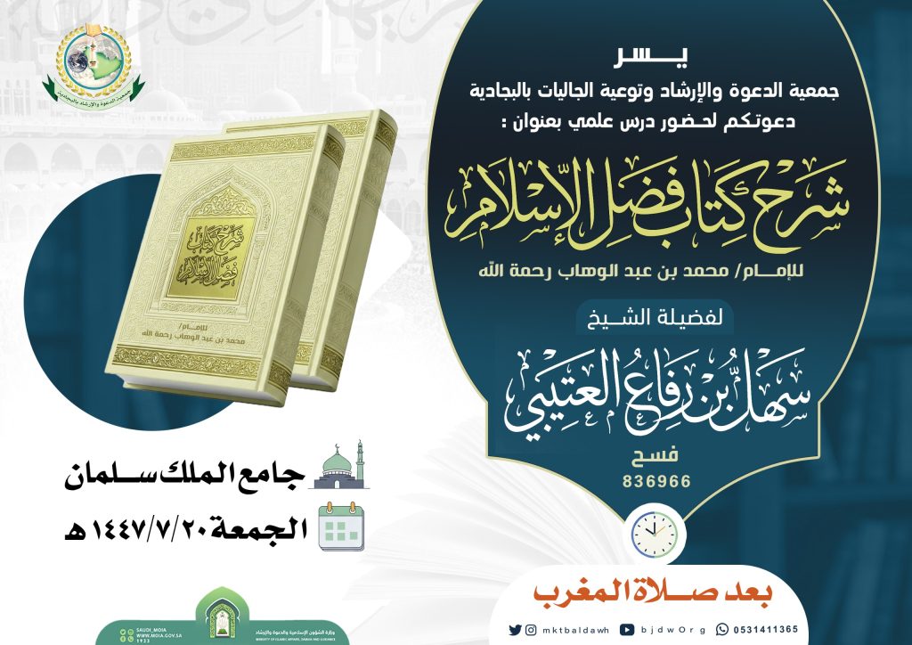 يناير42026الأخبارالأخبار غرِّد السلام عليكم ورحمة الله وبركاته جمعية الدعوة والارشاد وتوعية الجاليات بالبجادية تقدم لكم درس علمي بعنوان شرح كتاب فضل الإسلام لفضيلة الشيخ/ سهل بن رفاع العتيبي في جامع الملك سلمان بالبجادية يوم الجمعة الموافق 1447/7/20هـ فسح رقم 836966 غرِّد أخبار ذات صلةدعوه محاضرة نسائية عن بعد الداعية / بثينه سلطان المقيرنالأربعاء _21 _يناير _2026AH 21-1-2026ADبرنامج دعوي لفضيلة الشيخ علي بن بجاد العتيبيالثلاثاء _20 _يناير _2026AH 20-1-2026ADالبرامج الدعوية لشهر شعبان 1447هجريالثلاثاء _20 _يناير _2026AH 20-1-2026ADبرنامج دعوي لفضيلة الشيخ/خالد بن عبدالعزيز بن موزانالأثنين _12 _يناير _2026AH 12-1-2026ADمحاضرة نسائية عن بعد للداعية / بدريه سعيد الوادعيالأثنين _12 _يناير _2026AH 12-1-2026ADتسجيل مرئي لمحاضرة فضيلة الشيخ/عبدالله بن حماد الرسي بتاريخ 11-7-1447هـالأثنين _5 _يناير _2026AH 5-1-2026AD