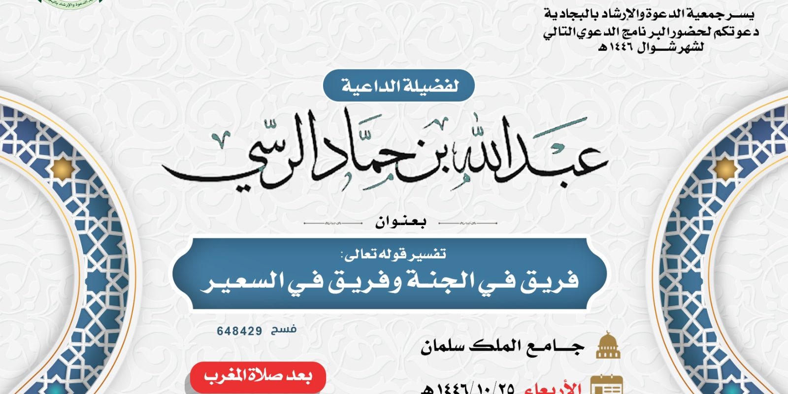 أبريل222025الأخبارالأخبار غرِّد تدعوكم جمعية الدعوة بالبجادية لحضور محاضرة لفضيلة الداعية/عبدالله حماد الرسي الأربعاء 1446/10/25هـ بعد صلاة المغرب جامع الملك سلمان ب البجادية غرِّد أخبار ذات صلةدرس علمي للنساء بعنوان [الأوراد والأذكار الشرعية في حياة المسلم]الخميس _4 _ديسمبر _2025AH 4-12-2025ADمحاضرة نسائية عن بعد للداعية / مضاوي عبدالرحمن عبدالله الدوسريالأربعاء _3 _ديسمبر _2025AH 3-12-2025ADبرنامج دعوي لفضيلة الشيخ عبدالرحمن بن فهد ودعانالثلاثاء _18 _نوفمبر _2025AH 18-11-2025ADبرنامج دعوي لفضيلة الشيخ أحمد بن عبدالله السلميالأحد _16 _نوفمبر _2025AH 16-11-2025ADبرنامج دعوي يوم الخميس الموافق 1447/5/22هـالأثنين _10 _نوفمبر _2025AH 10-11-2025ADالجمعية تحصل على درجة 97.26% في تقييم معايير الحوكمةالأثنين _10 _نوفمبر _2025AH 10-11-2025AD