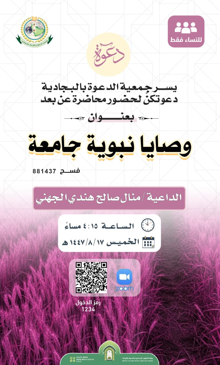 السلام عليكم ورحمة الله وبركاته يسر جمعية الدعوة ب #البجادية دعوتكن لحضور محاضرة نسائية عن بعد الداعية / منال صالح الجهني بعنوان [وصايا نبوية جامعة] يوم الخميس الموافق. 1447/8/17 هـ الساعة الرابعة والربع مساء رقم الفسح 881437 عبر الرابط التالي http://us02web.zoom.us/j/85261091380 رمز الدخول 1234