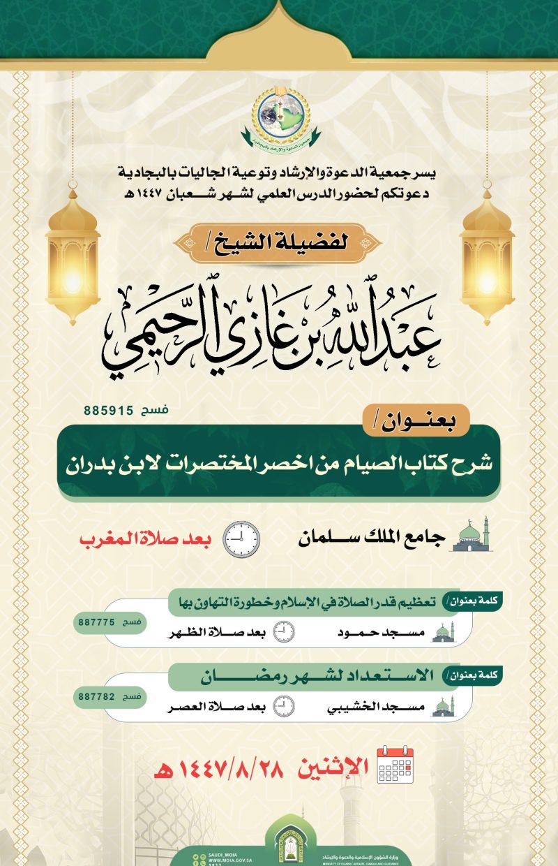 تدعوكم جمعية الدعوة والارشاد وتوعية الجاليات بالبجادية لحضور درس علمي بعنوان/شرح كتاب الصيام من اخصر المختصرات لابن بدران لفضيلة الشيخ/عبدالله بن غازي المطيري بتاريخ 28-8-1447هـ