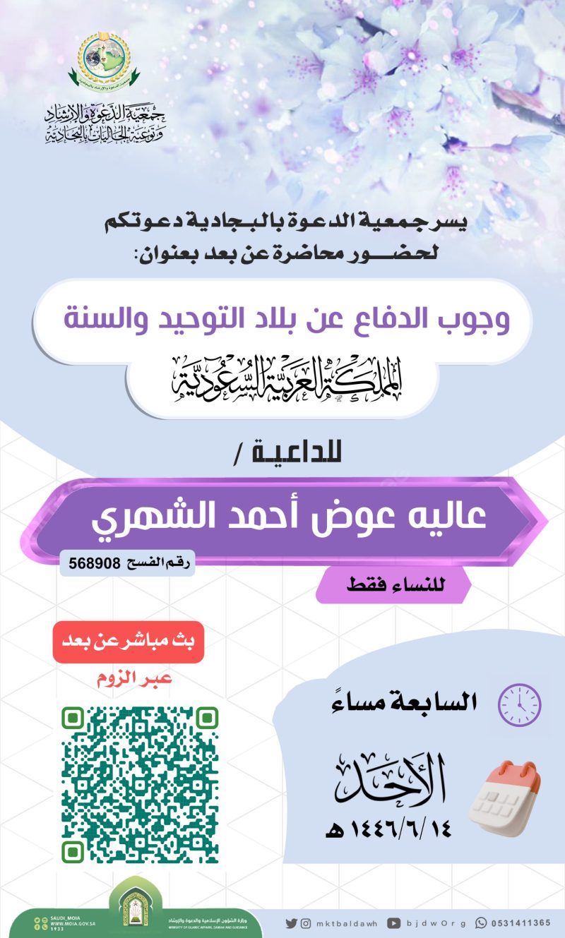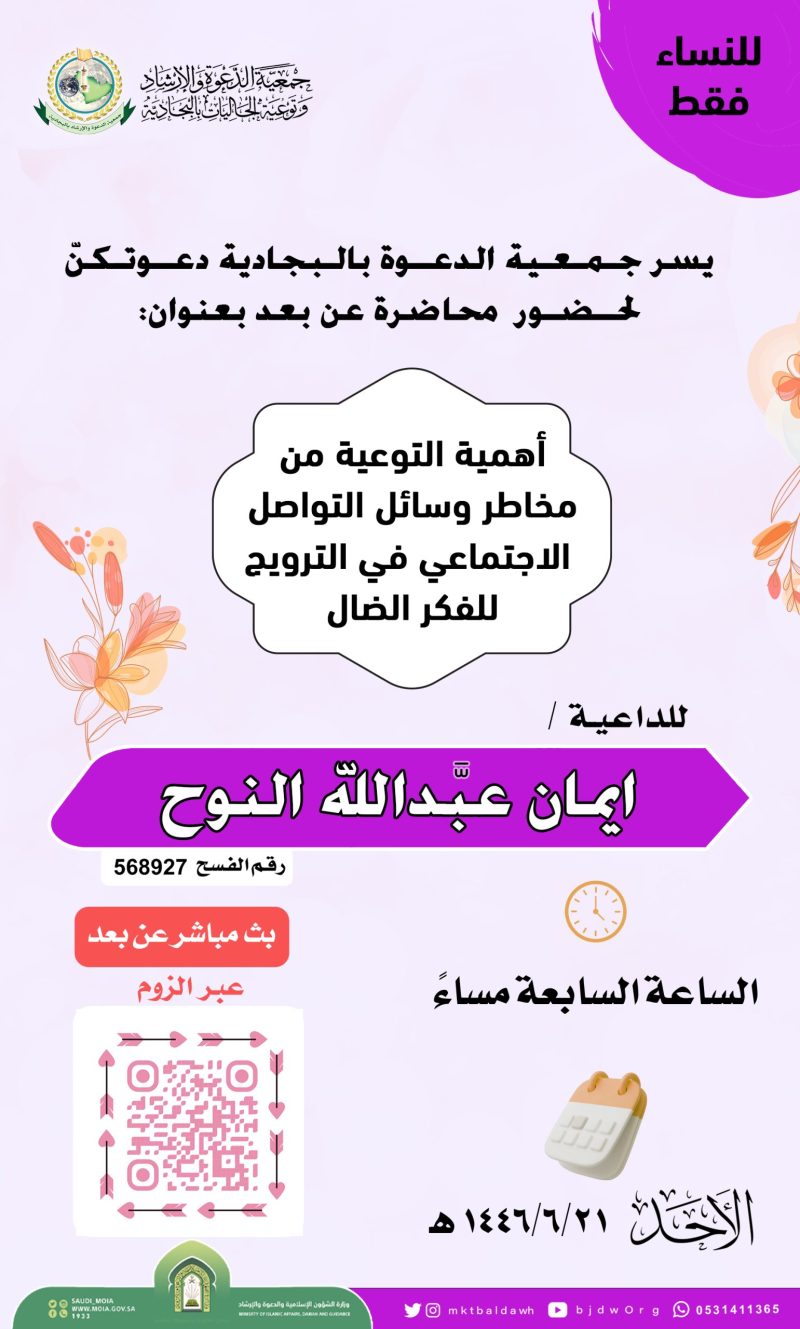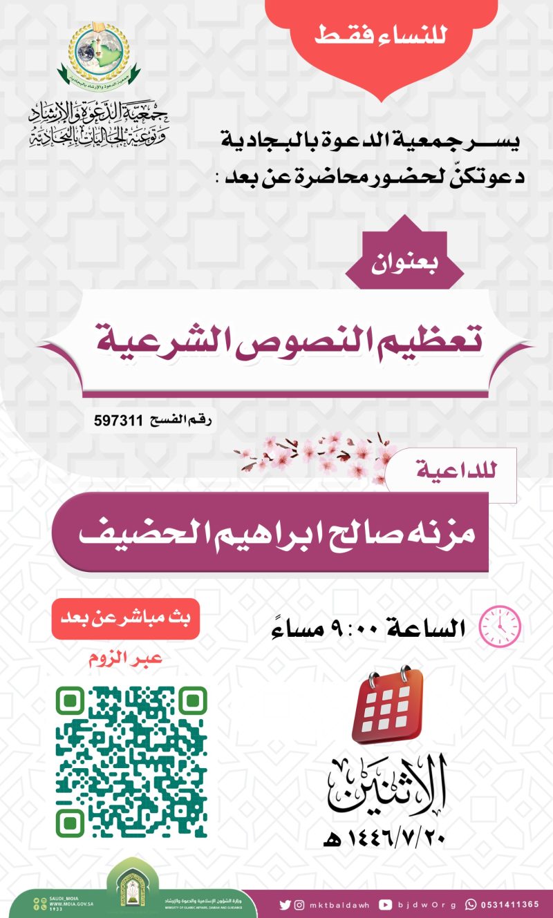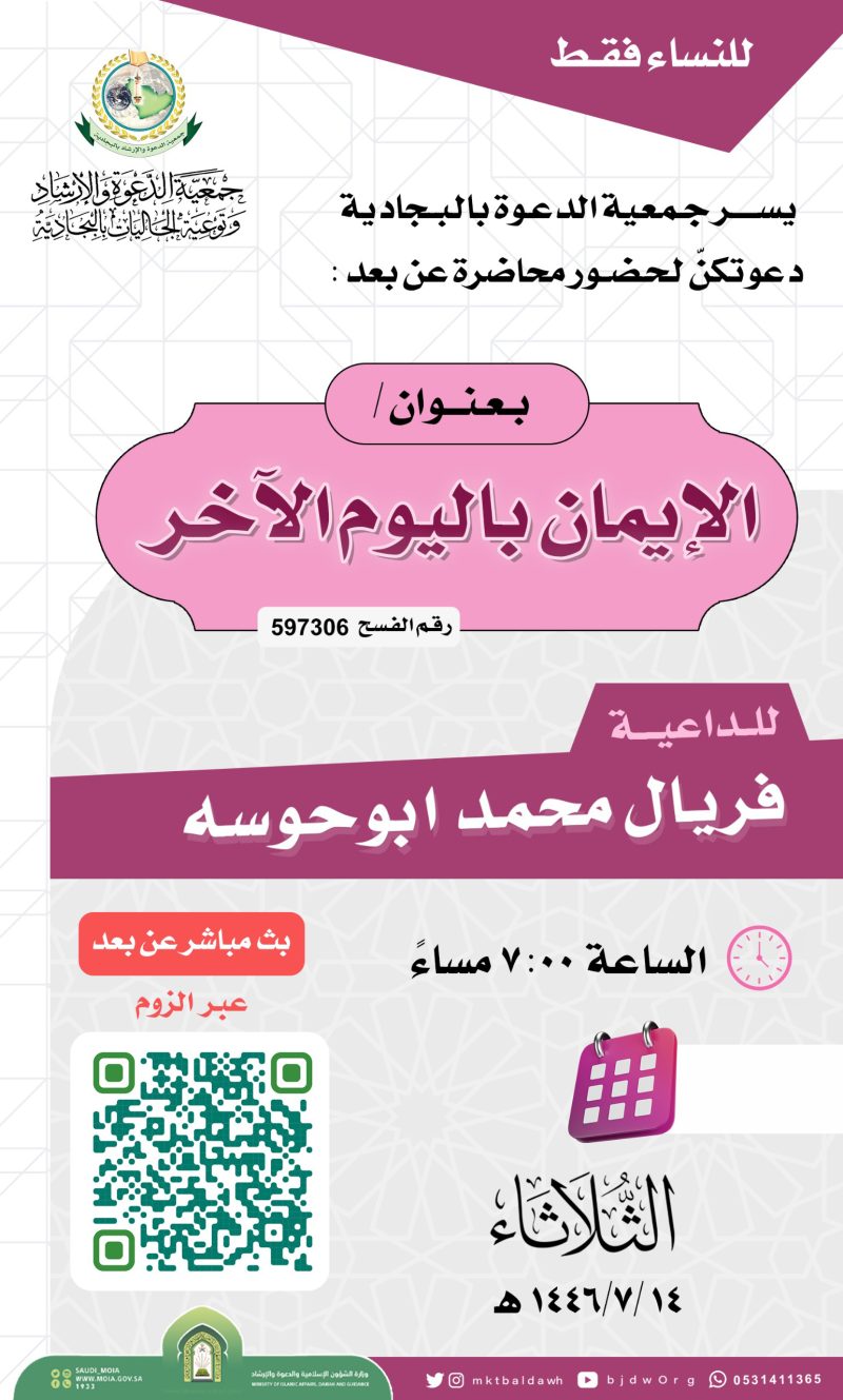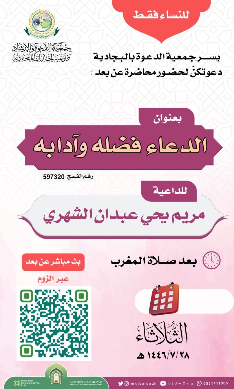 السلام عليكم ورحمة الله وبركاته تدعوكنّ جمعية الدعوة بالبجادية لحضور محاضرة نسائية عن بعد للداعية/مريم يحيى الشهري بعنوان / الدعاء فضله وآدابه اليوم الثلاثاء 1446/7/28هـ بعد صلاة المغرب عبر برنامج الزوم عن طريق الرابط التالي من هنا