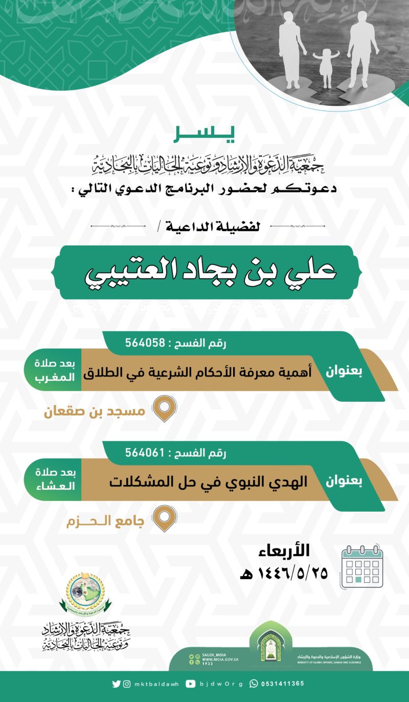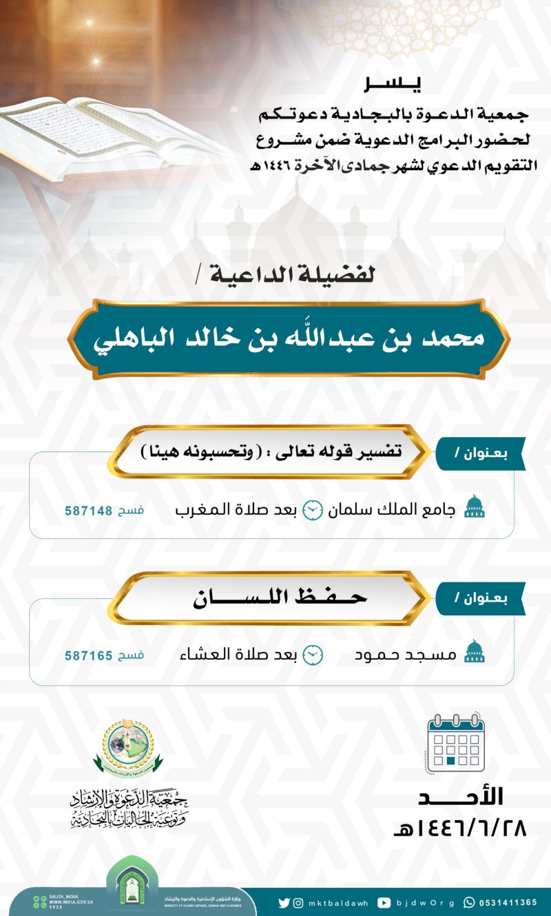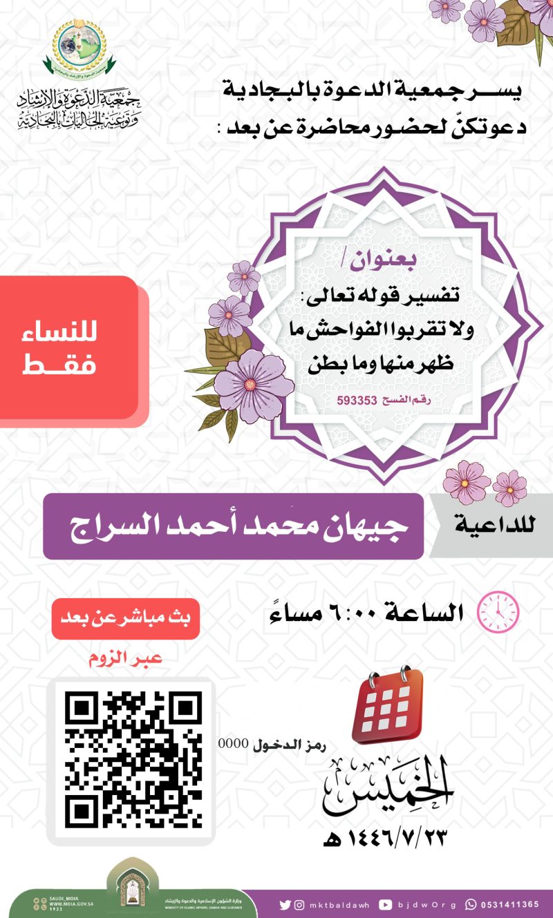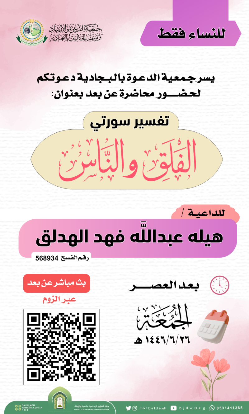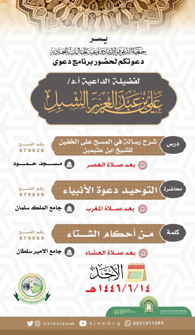السلام عليكم ورحمة الله وبركاته تدعوكنّ جمعية الدعوة بالبجادية لحضور محاضرة نسائية عن بعد للداعية/مريم يحيى الشهري بعنوان / الدعاء فضله وآدابه اليوم الثلاثاء 1446/7/28هـ بعد صلاة المغرب عبر برنامج الزوم عن طريق الرابط التالي من هنا