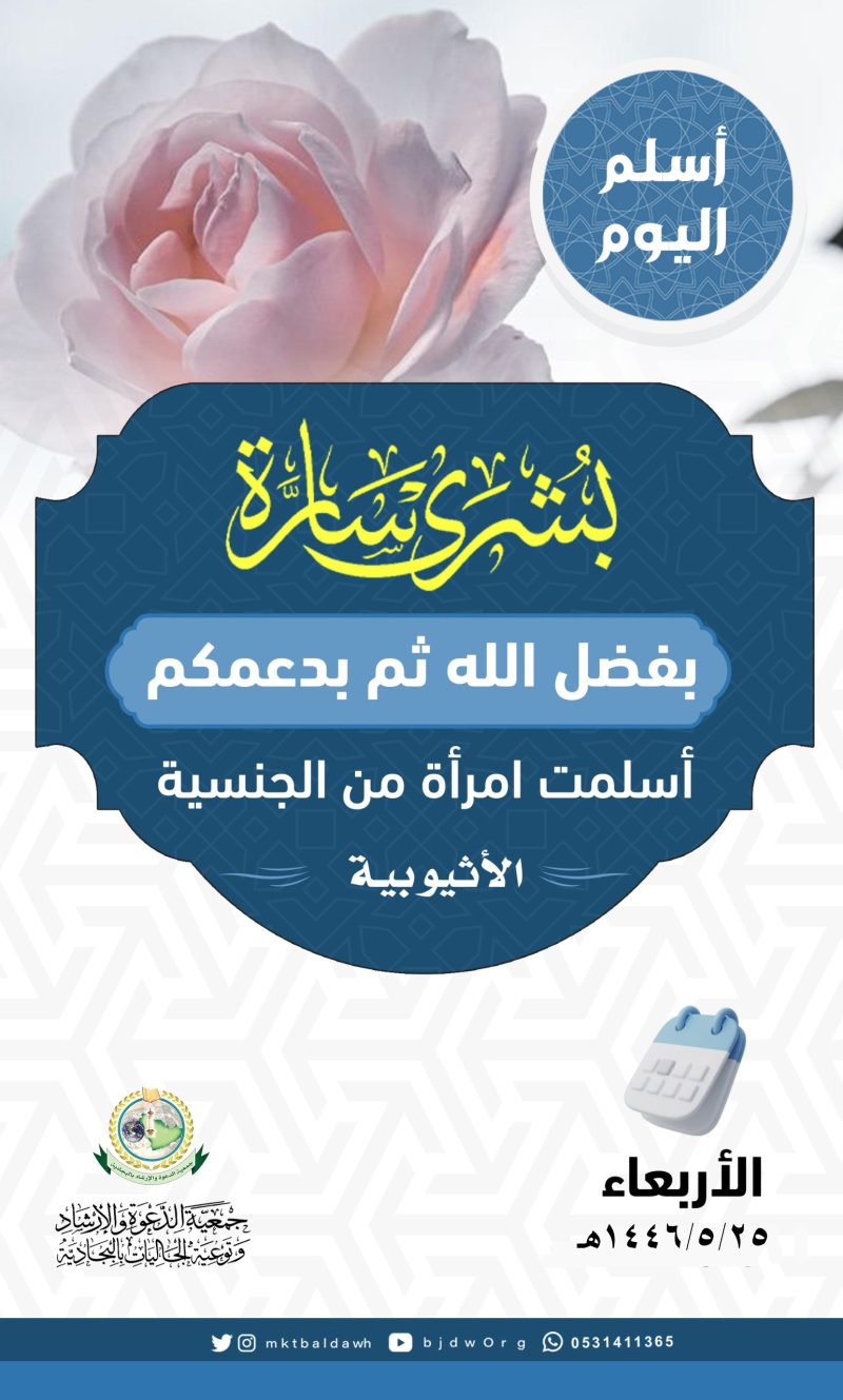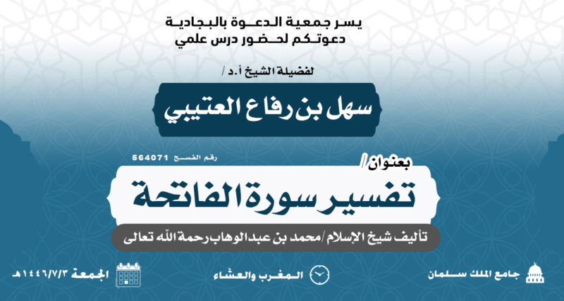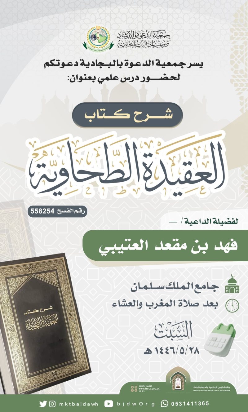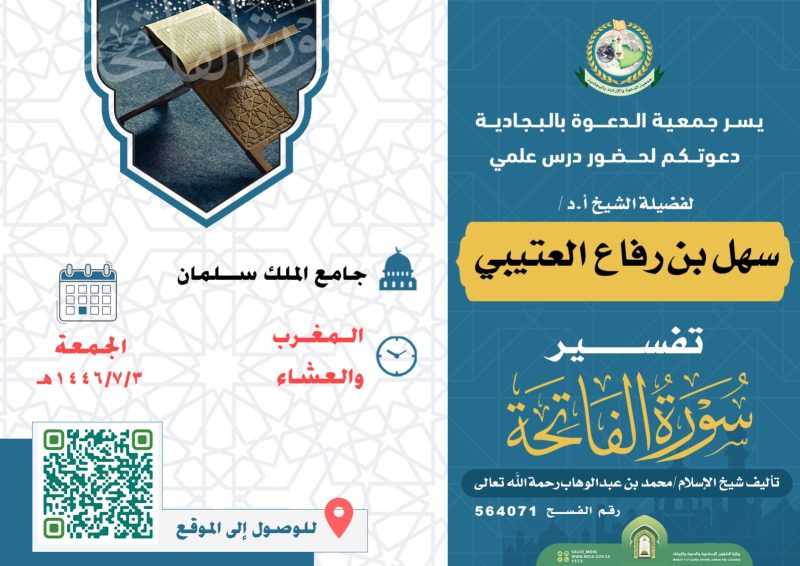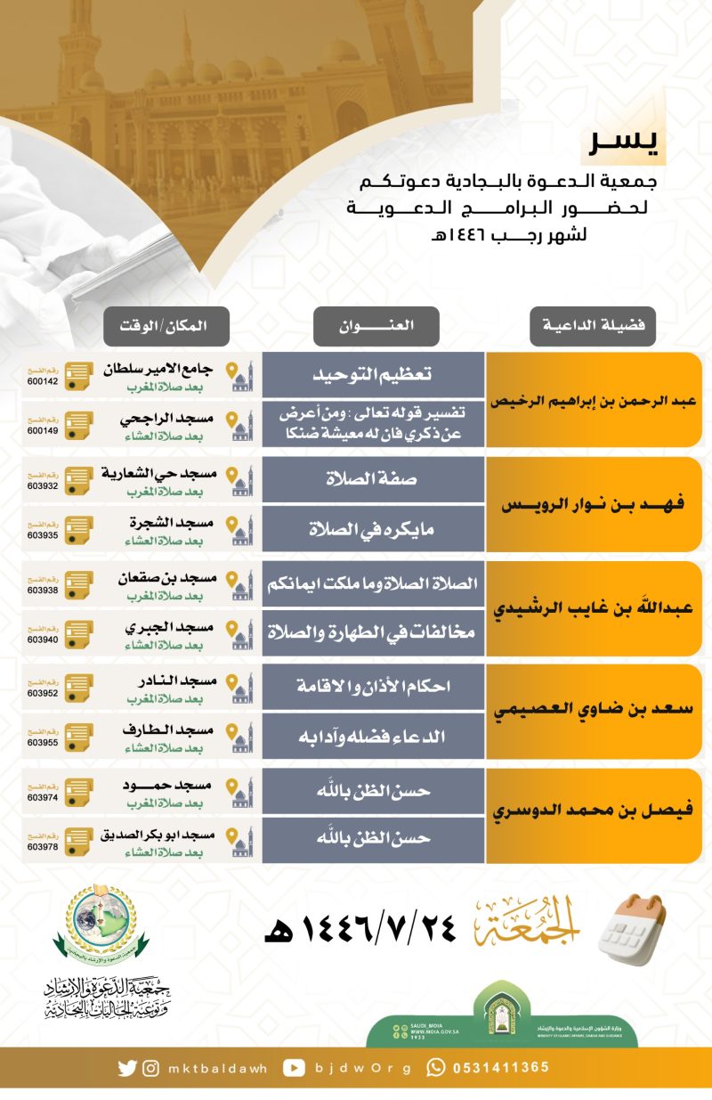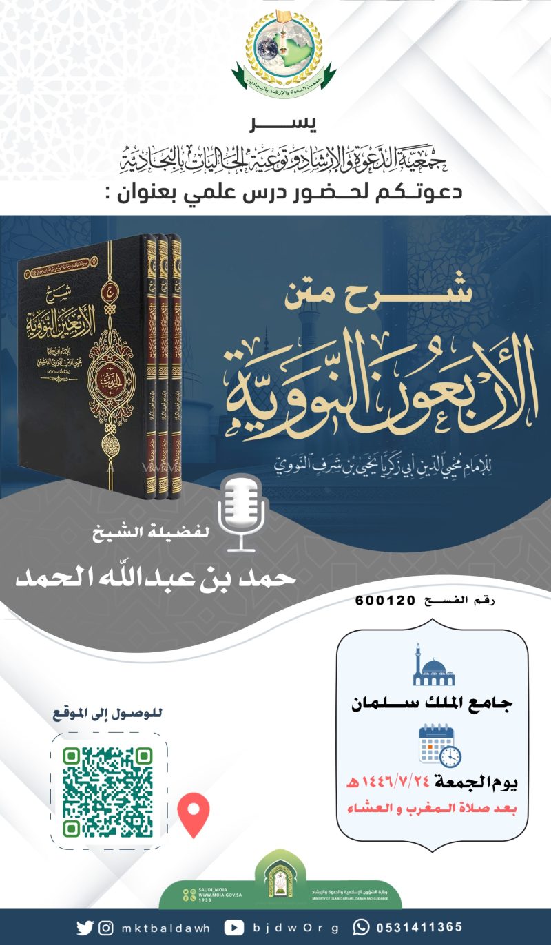 السلام عليكم ورحمة الله وبركاته تدعوكنّ جمعية الدعوة بالبجادية لحضور محاضرة نسائية عن بعد للداعية/مريم يحيى الشهري بعنوان / الدعاء فضله وآدابه اليوم الثلاثاء 1446/7/28هـ بعد صلاة المغرب عبر برنامج الزوم عن طريق الرابط التالي من هنا