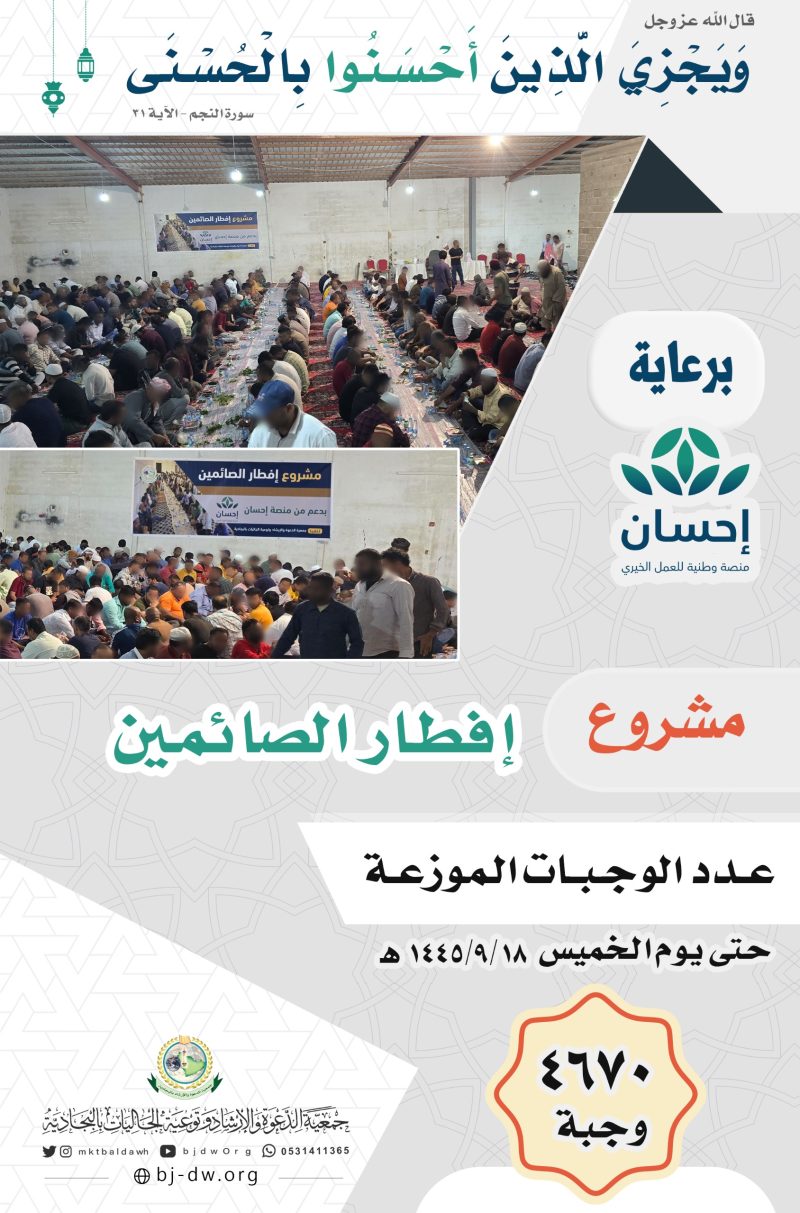 السلام عليكم ورحمة الله وبركاته تقبل الله منا ومنكم صالح الأعمال ثم نقدم لكم إحصائية برامج شهر رمضان المبارك إعادة الله علينا وعليكم باليمن والبركات جزى الله تعالى خيراً كل من ساهم في تلك البرامج وبارك له وأخلف عليه خيراً مما أنفق ثم الشكر موصولا. لكل الداعمين للجمعية سواءً بأموالهم أوأفكارهم أو دعواتهم أو عبر…