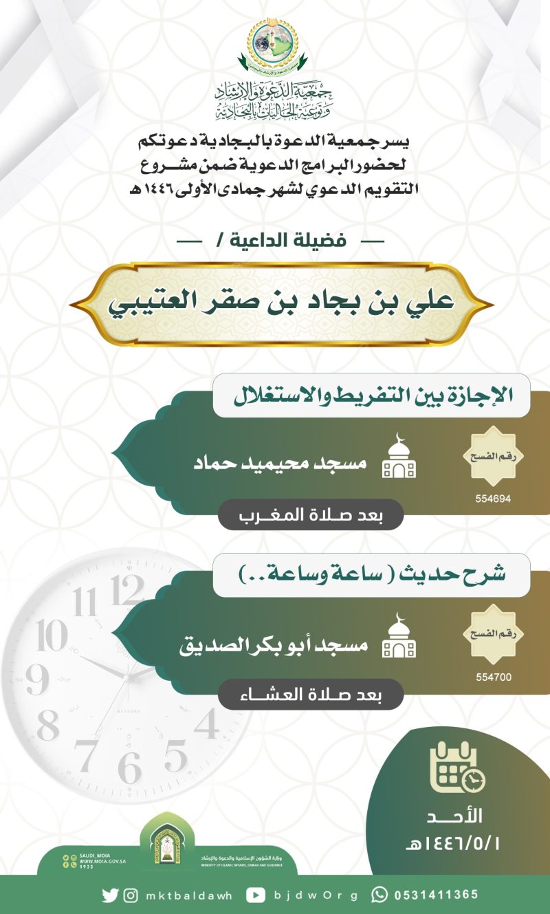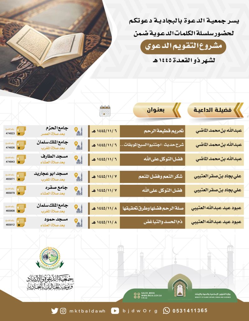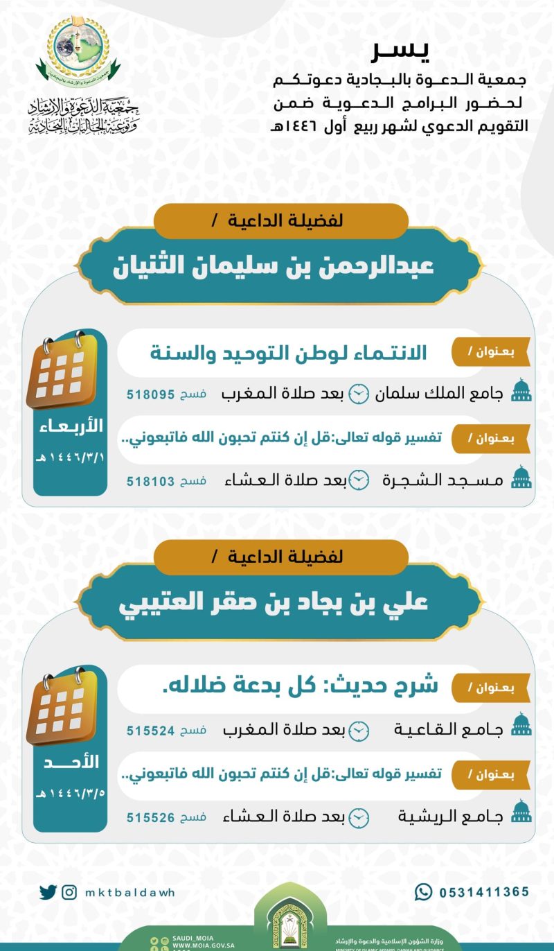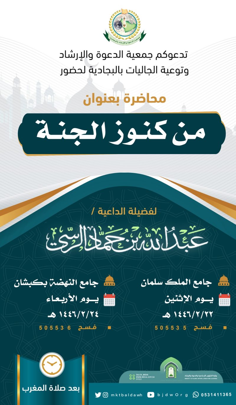 السلام عليكم ورحمة الله وبركاته تدعوكم جمعية الدعوة بالبجادية لحضور البرامج الدعوية لشهر ذو الحجة لفضيلة الداعية/خالد بن عبدالعزيزبن ابراهيم بن موزان  ضمن التقويم الدعوي للعـــــــــــــام 1445هجري