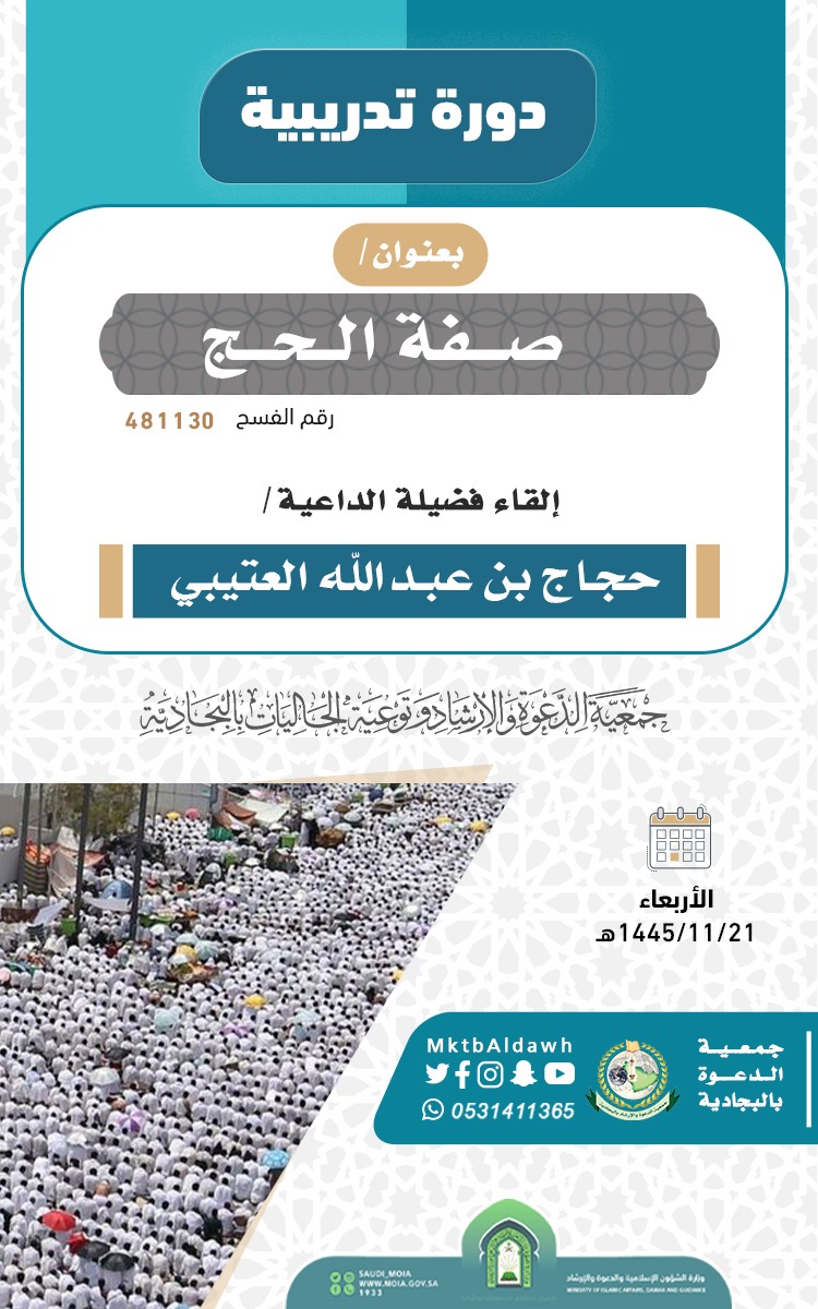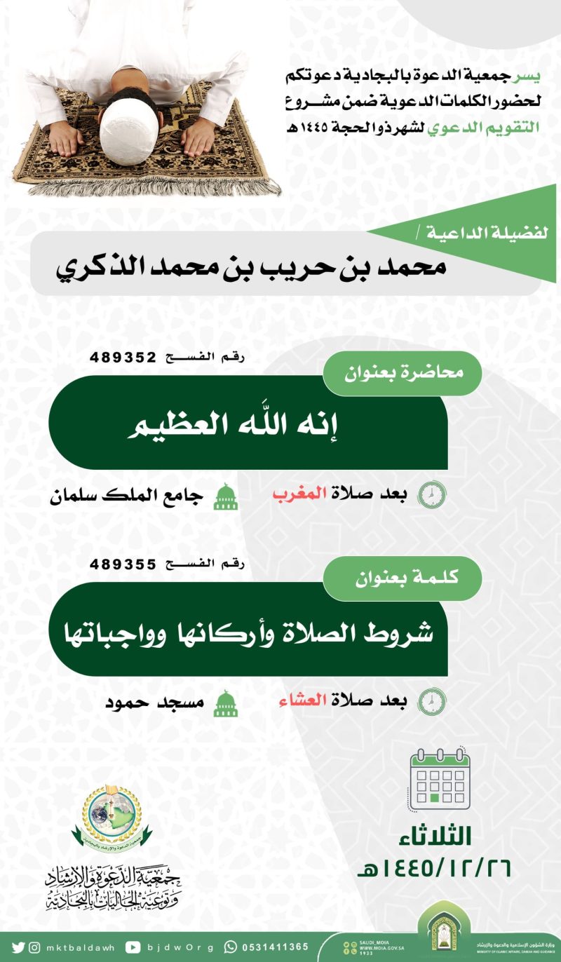 السلام عليكم ورحمة الله وبركاته تدعوكم جمعية الدعوة بالبجادية لحضور البرامج الدعوية لشهر ذو الحجة لفضيلة الداعية/محمد بن حريب الذكري  ضمن التقويم الدعوي للعـــــــــــــام 1445هجري