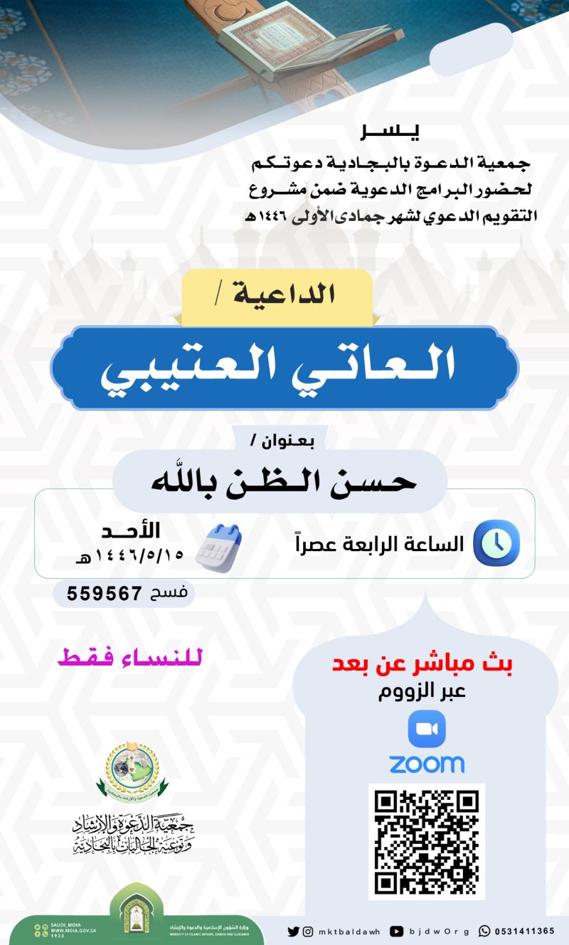 السلام عليكم ورحمة الله وبركاته تدعوكنّ جمعية الدعوة بالبجادية لحضور كلمة دعوية نسائية عن بعد بعنوان حسن الظن بالله ظمن أنشطة التقويم الدعوي عبر برنامج الزوم عن طريق الرابط التالي من هنا