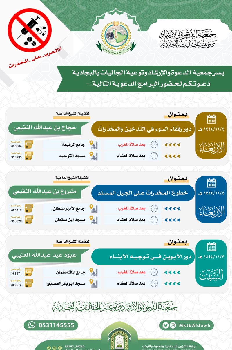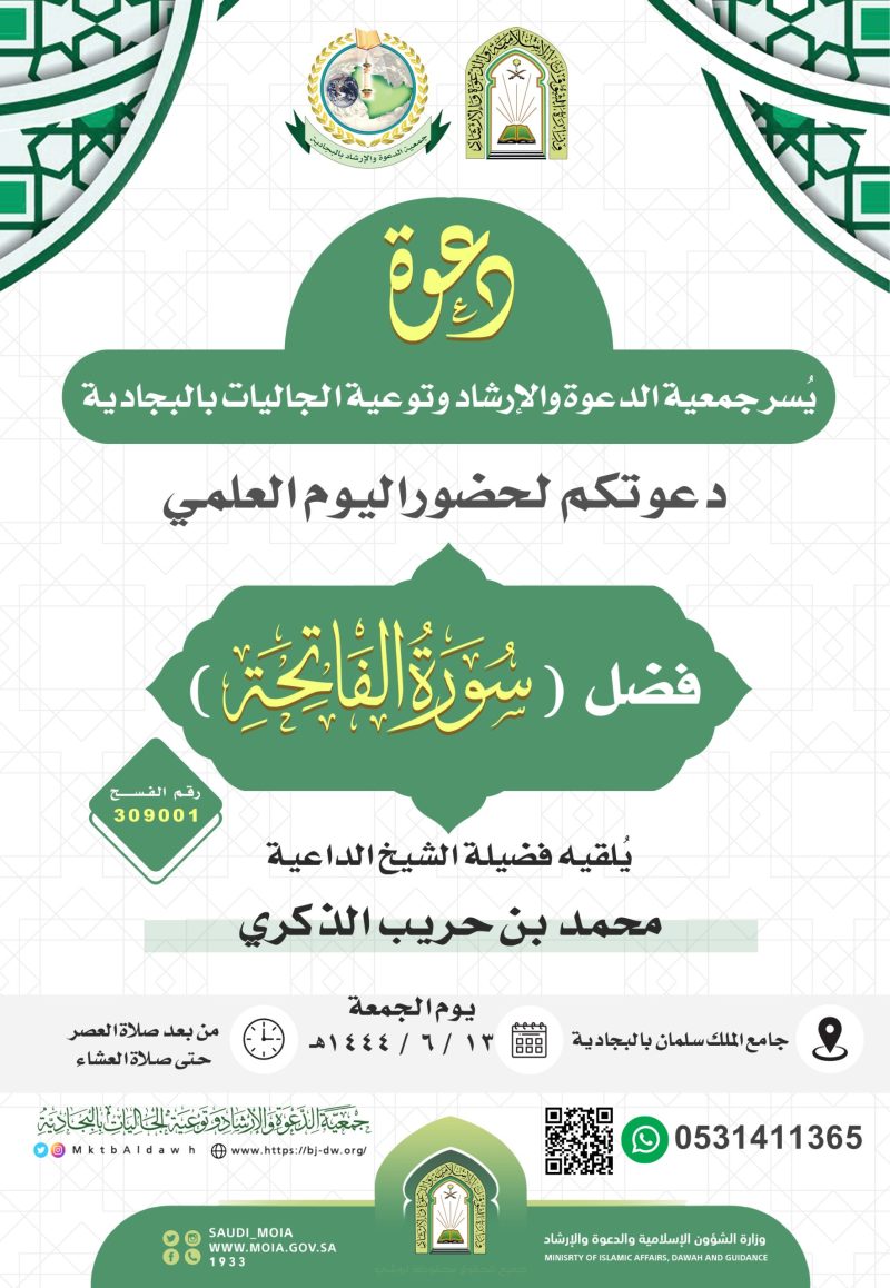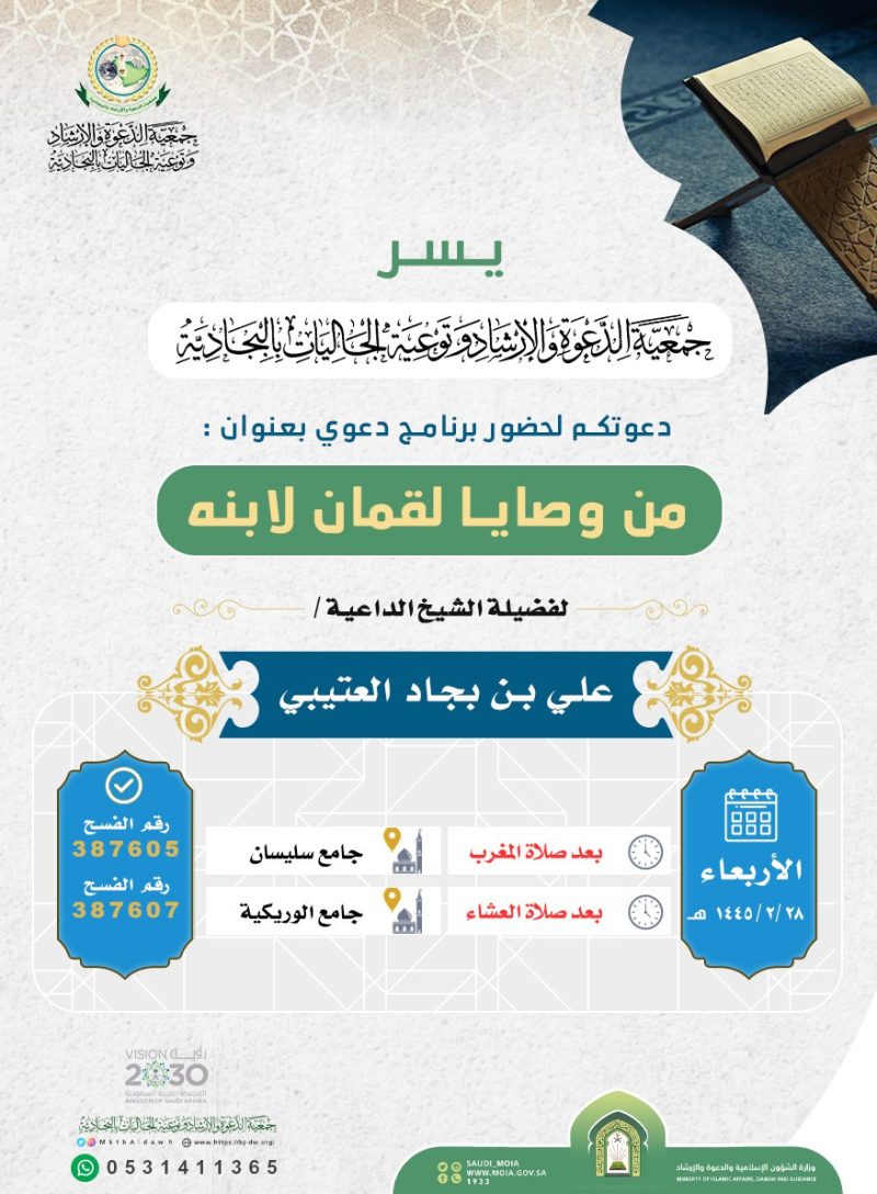 السلام عليكم ورحمة الله وبركاته تدعوكم جمعية الدعوة والإرشاد وتوعية الجاليات بالبجادية لحضور محاضرة لفضيلة الشيخ الاستاذ الدكتور/ عبدالسلام بن عبدالله السليمان عضور هيئة كبار العلماء وعضو اللجنة الدائمة للأفتاء يوم الأربعاء الموافق 1445/3/26 بعد صلاة المغرب في جامع الملك سلمان حفظه الله