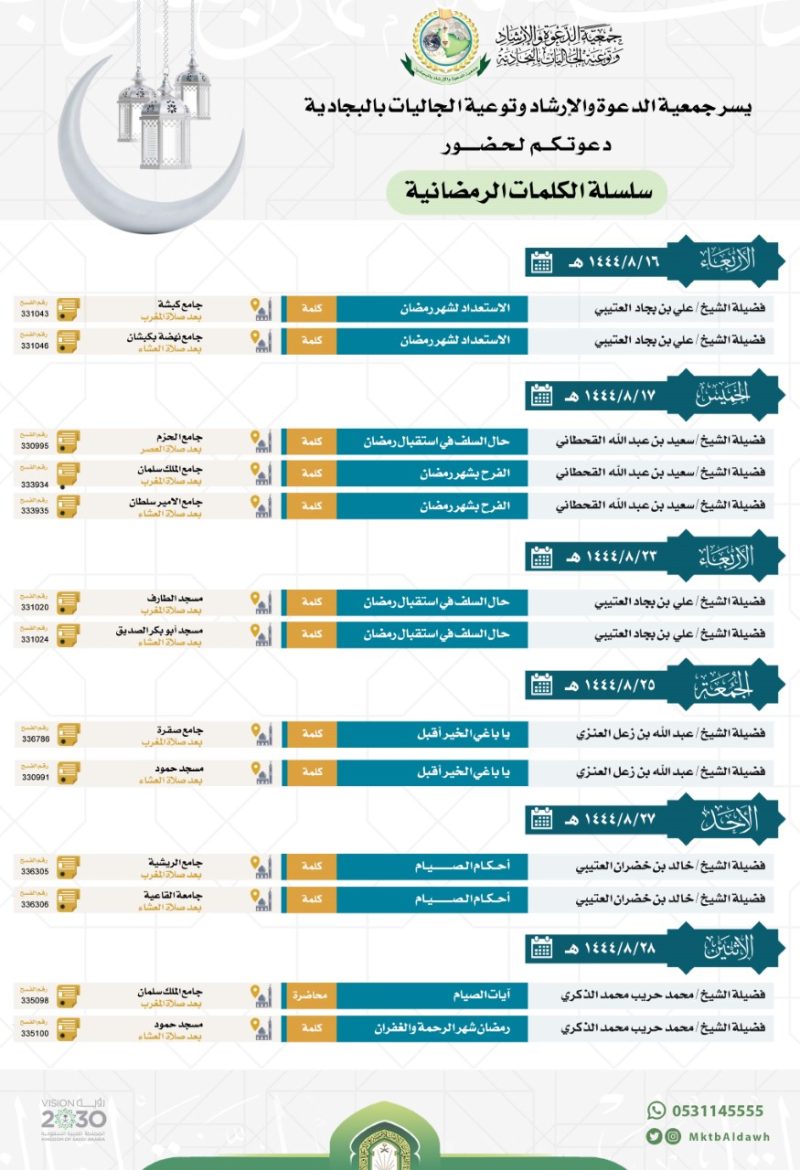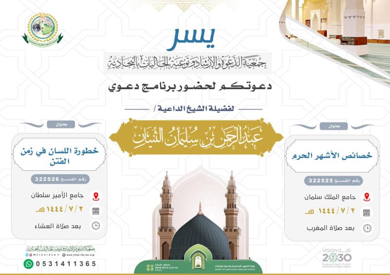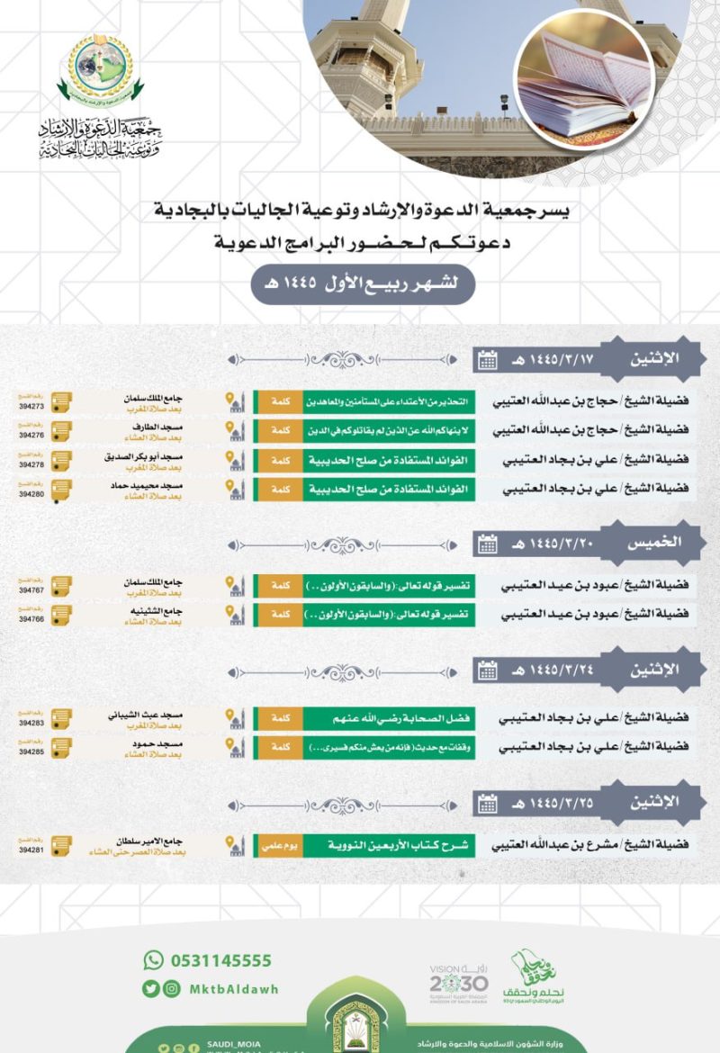 السلام عليكم ورحمة الله وبركاته تدعوكم جمعية الدعوة بالبجادية  لحضور سلسلة البرامج الدعوية لشهرمحرم للعام 1445 هجري السلسلة رقم (2) -لفضيلة الداعية عبود بن عيد العتيبي -فضيلة الداعية علي بن بجاد العتيبي